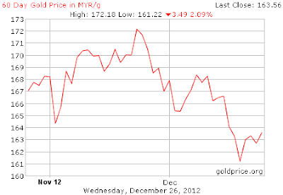 kemuncak semasa penghujung November 2012 sehingga RM172.2 per/g.